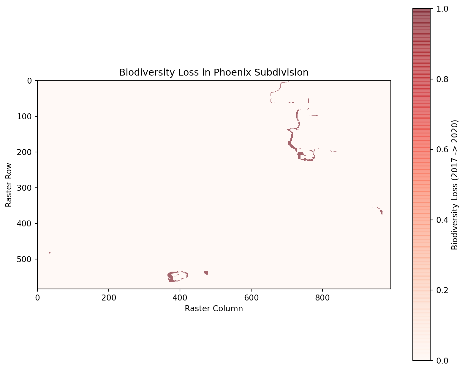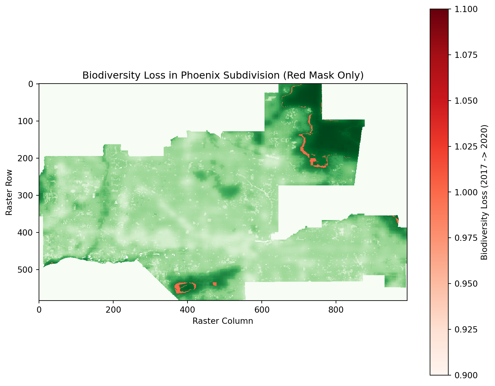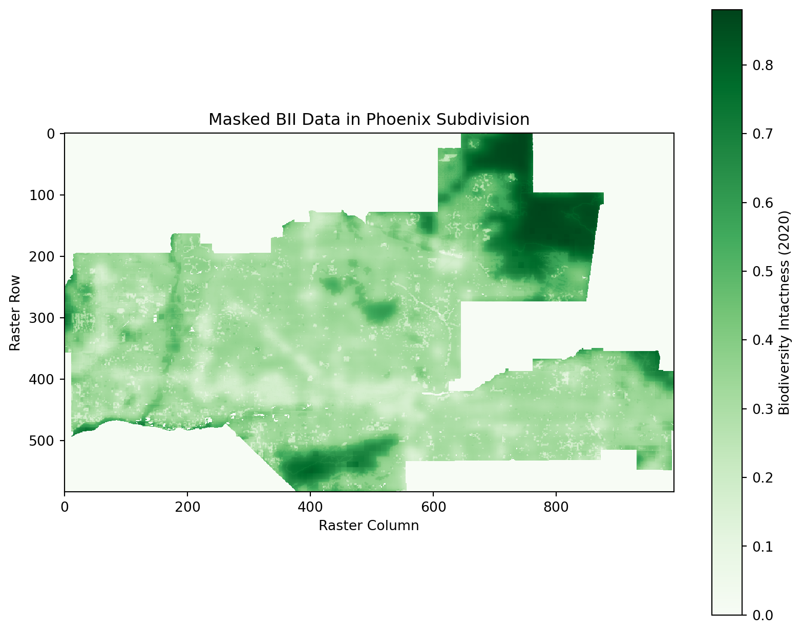 This notebook analyzes the Biodiversity Intactness Index (BII) within the Phoenix subdivision for the years 2017 and 2020. It calculates biodiversity loss, visualizes the results, and identifies areas where biodiversity was maintained or declined.