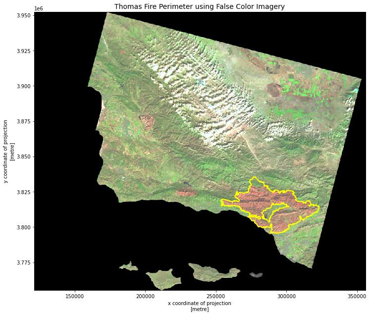 Finally, we overlay the Thomas Fire perimeter on the False Color image. This shows exactly where the fire burned. We can see distinctly see how large of an impact it had in comparison to the other scars on our plot.