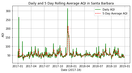 For this section we will be analyzing air quality info (AQI) during the Thomas Fire. By looking at daily AQI and calculating a 5-day rolling average we can see how the fire impacted air quality in Santa Barbara County.
